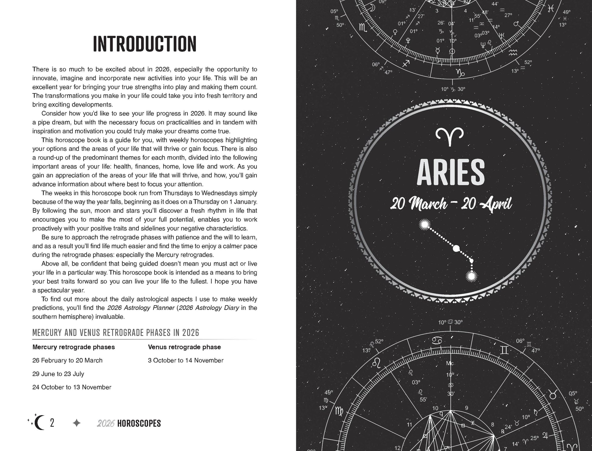 2026 Horoscopes also includes weekly predictions for each zodiac sign, revealing what you can expect and identifying the best days for attracting wealth, love, success, and more. The forecasts cover lunar phases, key dates for new and full moons, supermoons, and eclipses, and explain their personal significance for your sign.