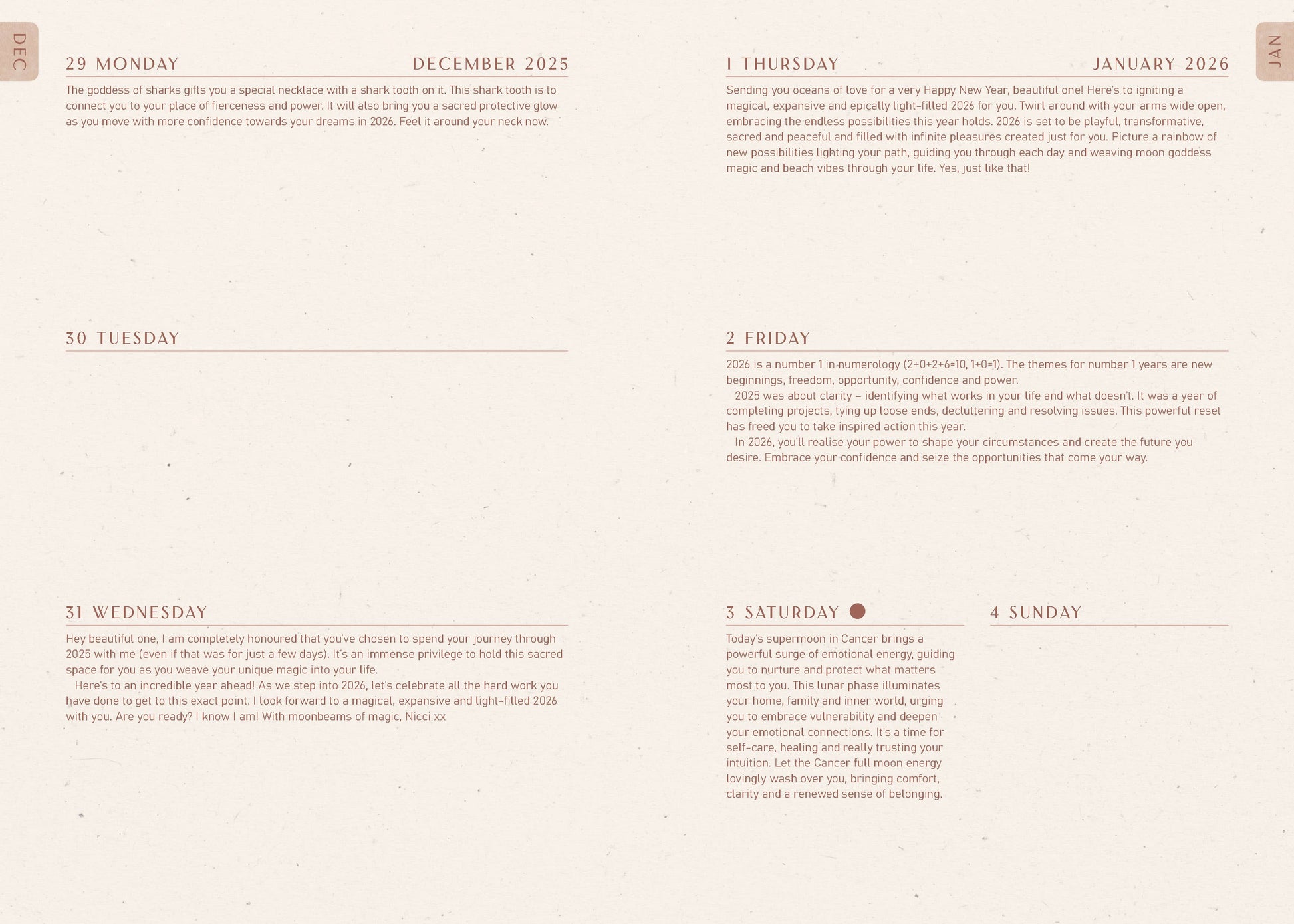 You will learn how to use crystals, essential oils, affirmations, rituals and songs to harness your potency, your inner goddess. This diary will guide you through 2026, teaching you to live in harmony and alignment with the moon and Mother Nature, transforming your life into one of clarity, balance, ease and joy.