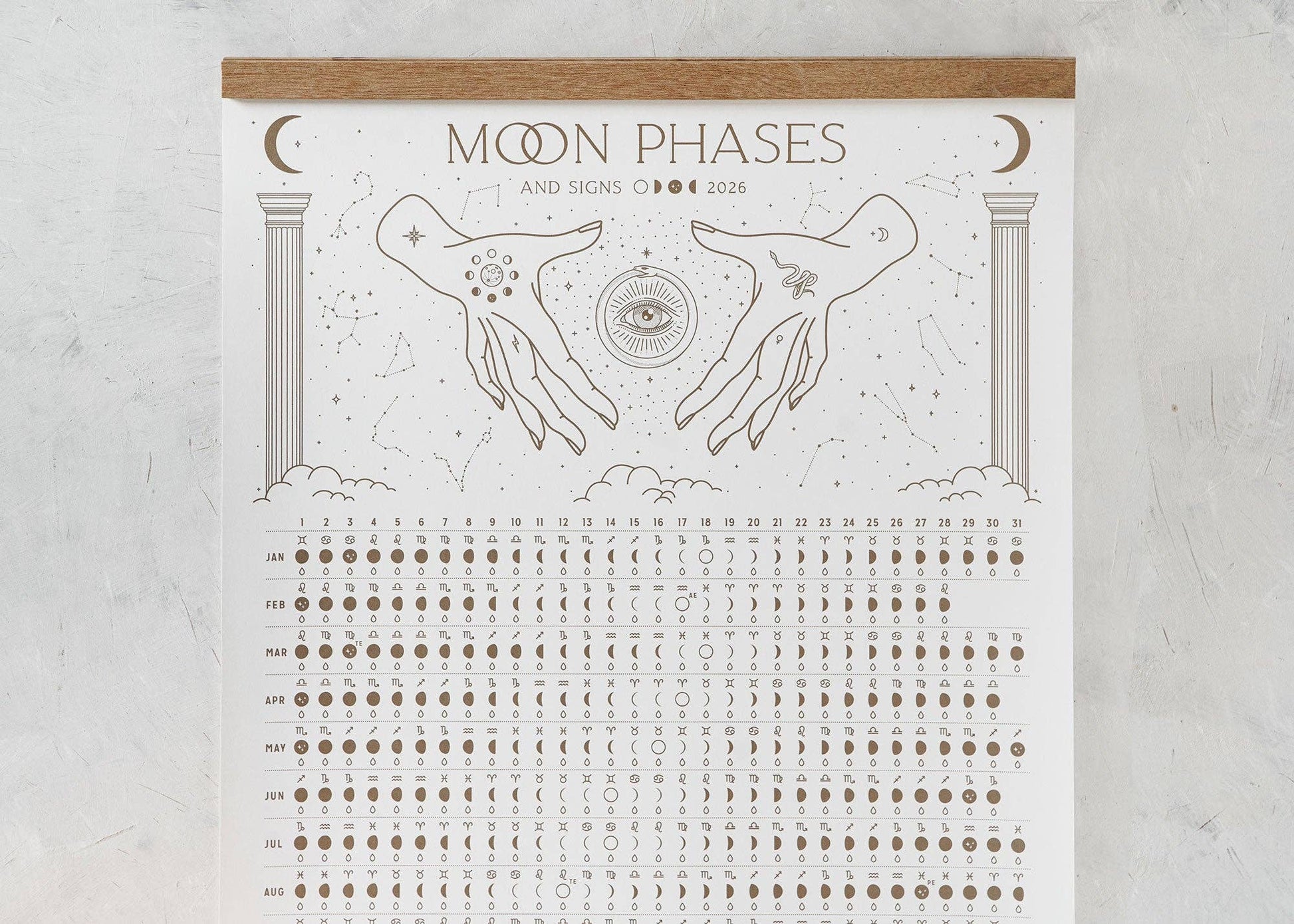 Adorn your sacred space and make a ritual of tracking the moon’s phases, signs and your cycle with our white and matte rose gold ink wall calendar.