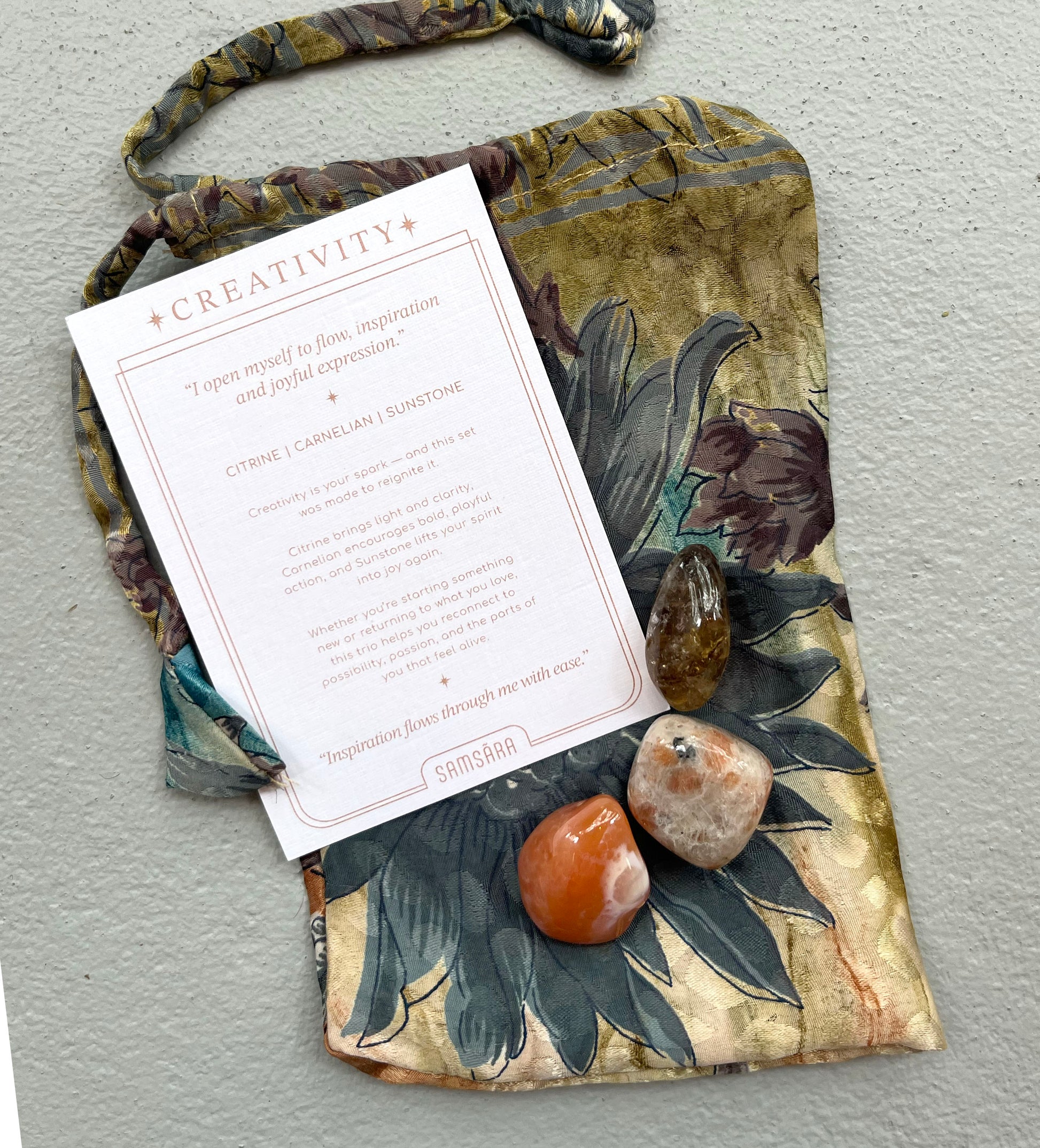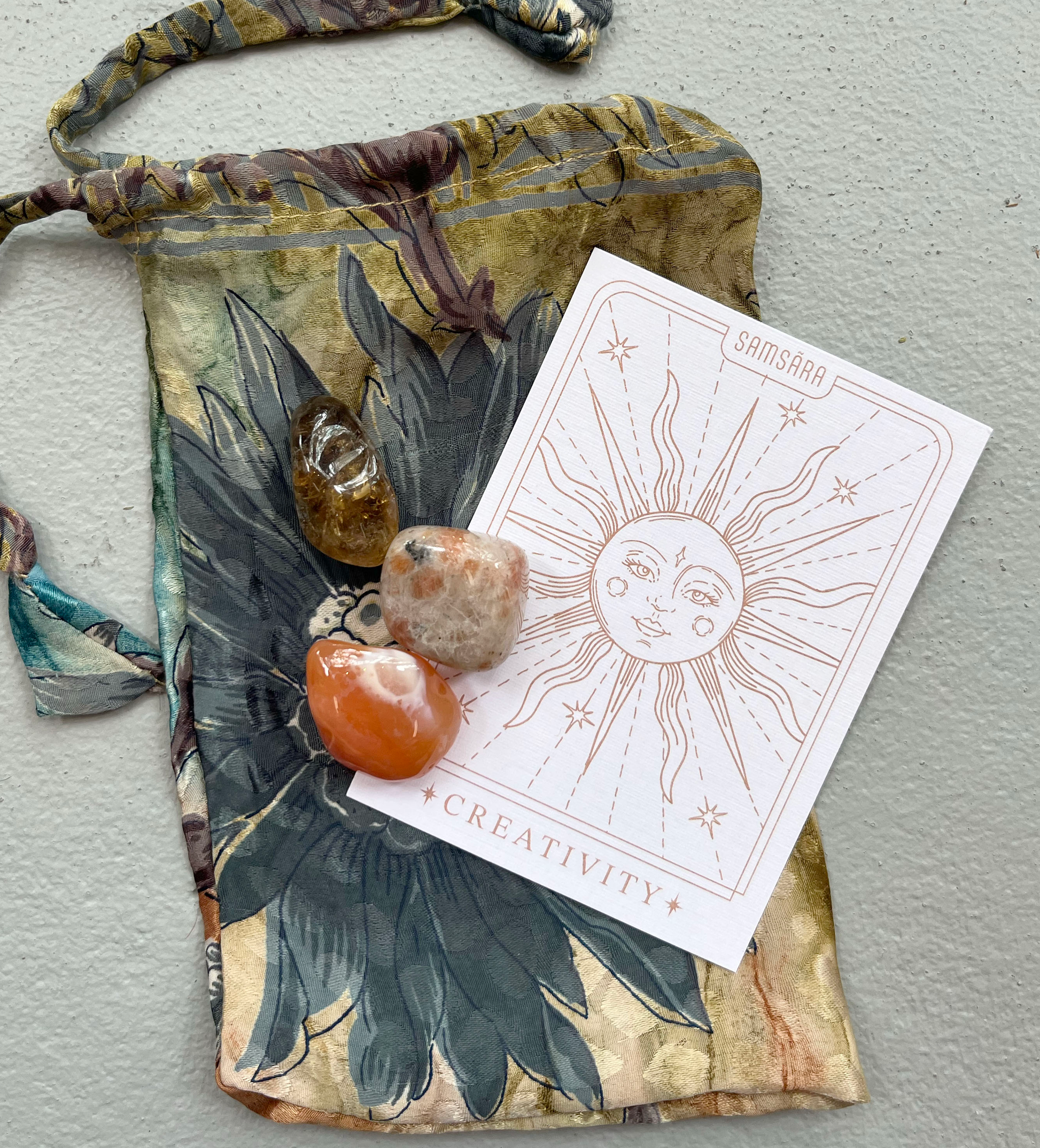 The crystals are tucked inside pouches made from repurposed sari fabric, sourced from India - giving new life to textiles rich with history and colour.