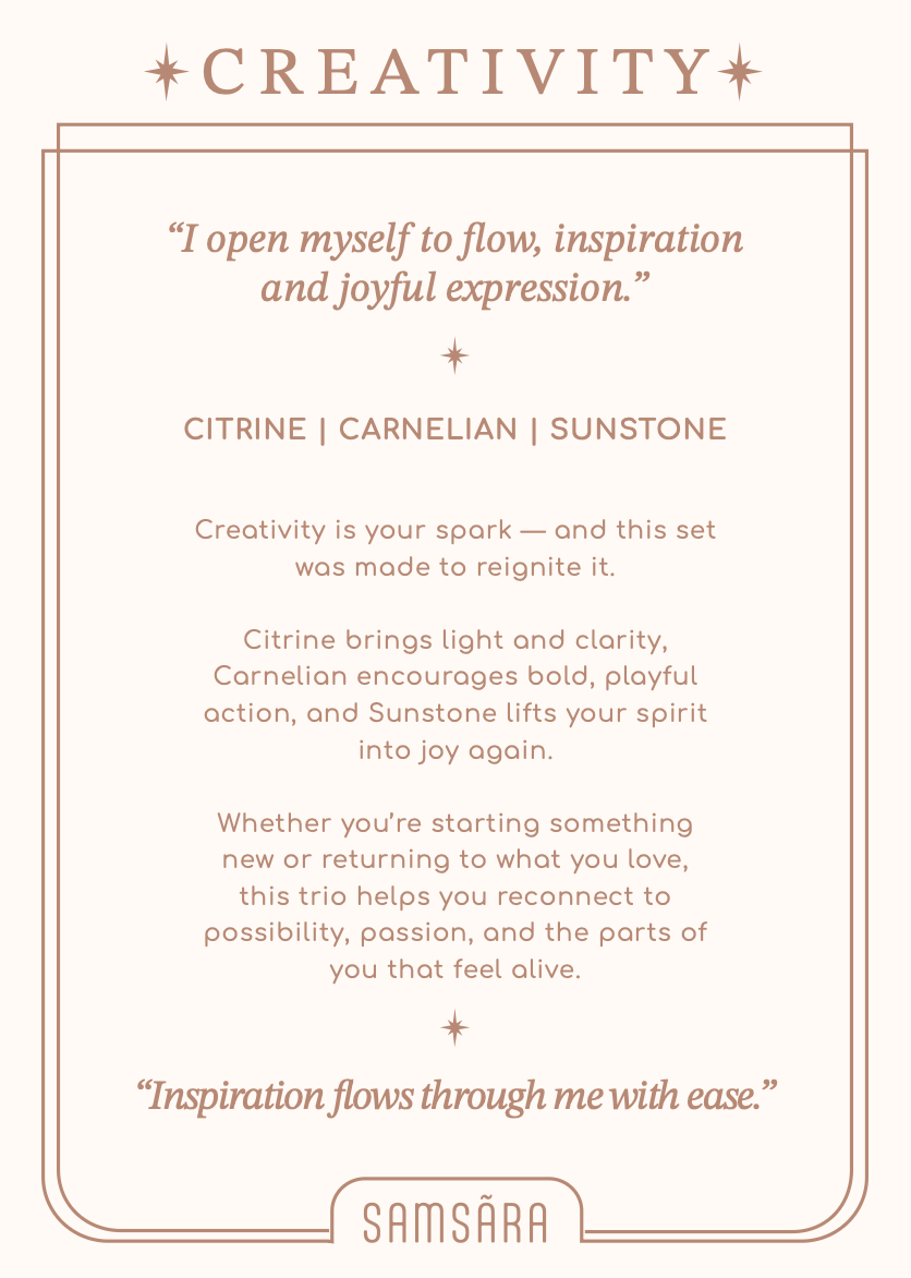 Creativity is your spark — and this set was made to reignite it. Citrine brings light and clarity, Carnelian encourages bold, playful action, and Sunstone lifts your spirit into joy again. Whether you’re starting something new or returning to what you love, this trio helps you reconnect to possibility, passion, and the parts of you that feel alive.