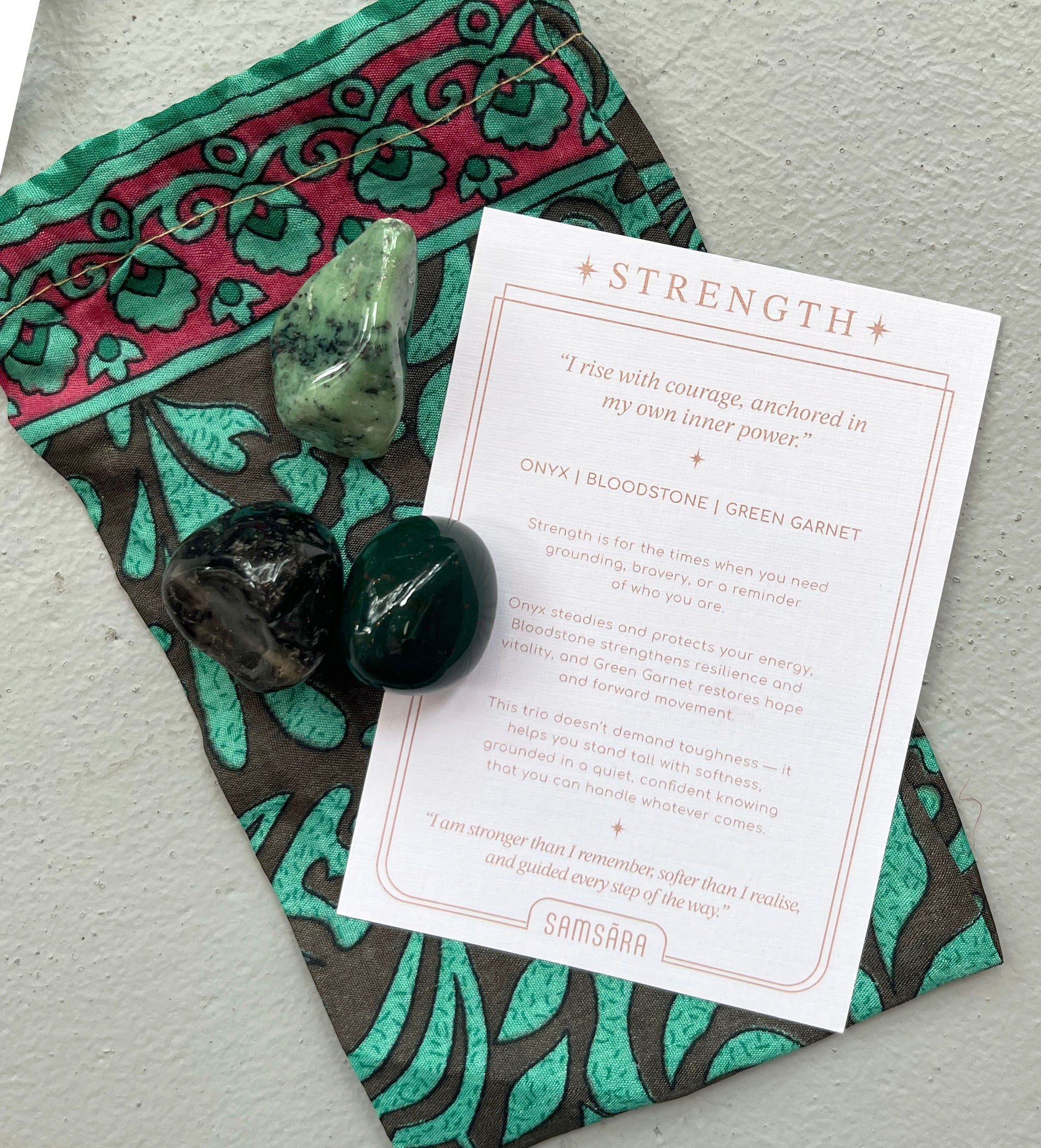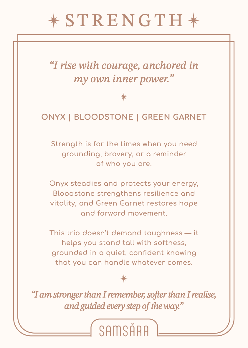 Strength is for the times when you need grounding, bravery, or a reminder of who you are. Onyx steadies and protects your energy, Bloodstone strengthens resilience and vitality, and Green Garnet restores hope and forward movement. This trio doesn’t demand toughness — it helps you stand tall with softness, grounded in a quiet, confident knowing that you can handle whatever comes.