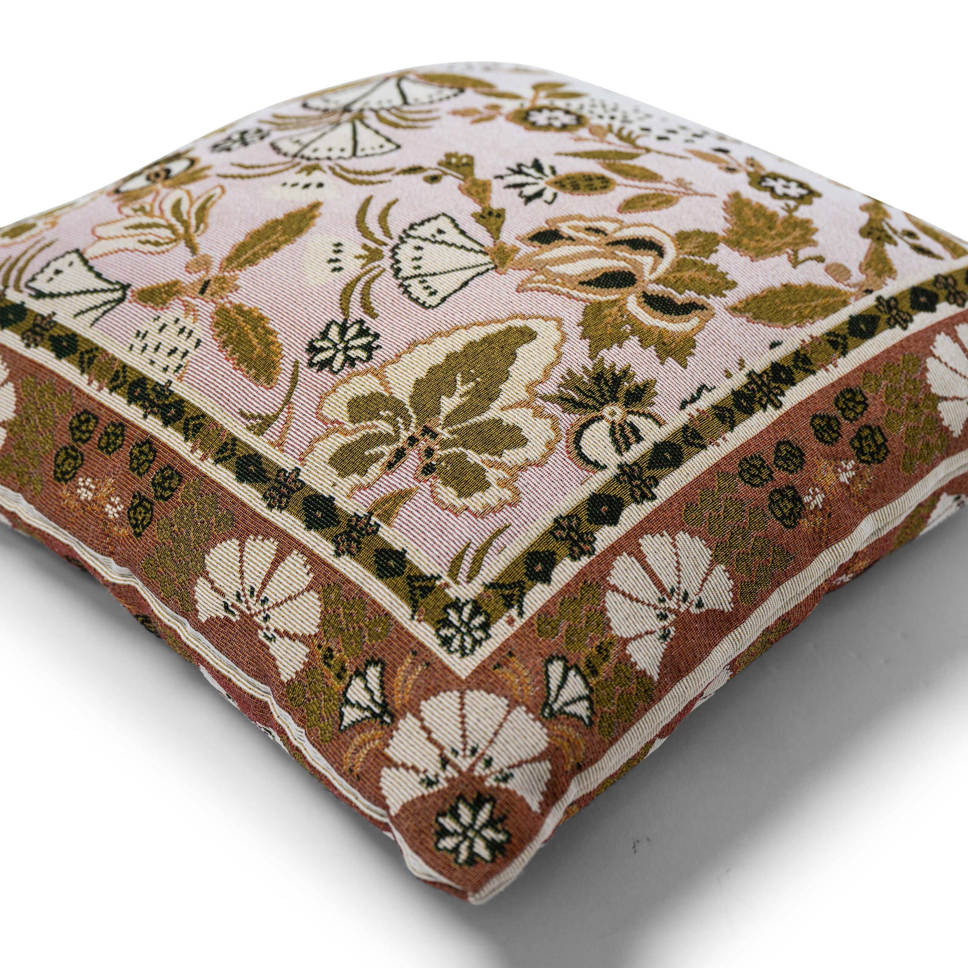 The Eleanor Rigby cushion cover is a gorgeous, feminine, floral and vintage design. It has a subtle and soft colour combination of blush, pale pink, cream and (almost metallic) olive accents.