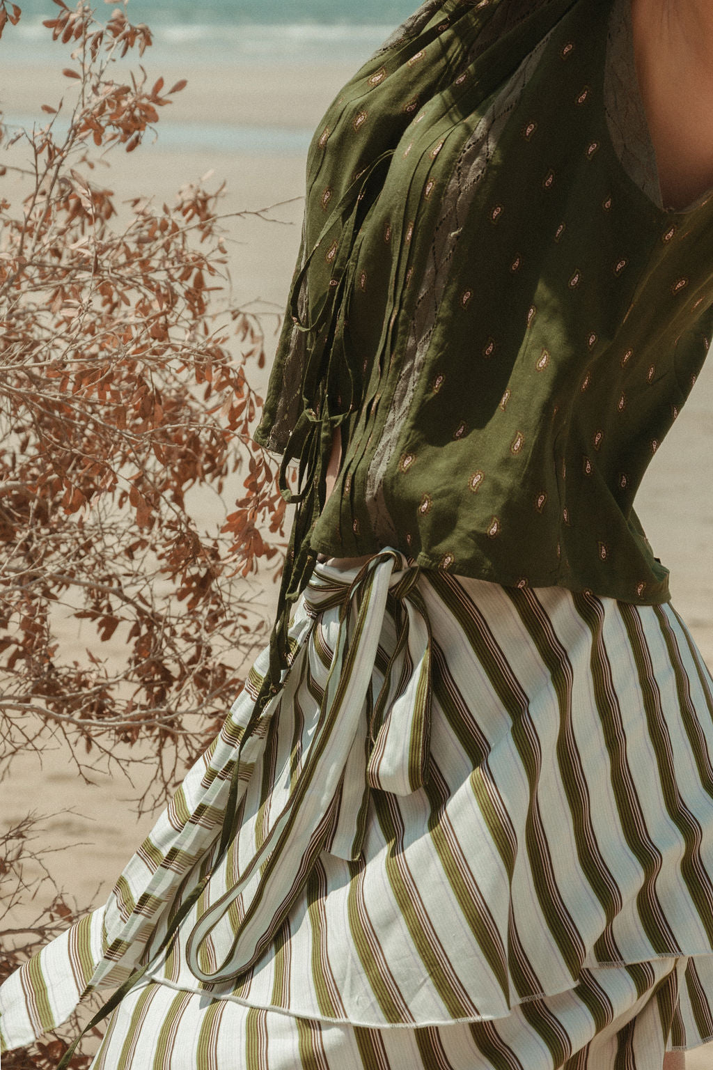 This layered wrap mini is designed as one size fits all, adjusting effortlessly to the body for a flattering and easy fit. Made from sustainable Ecovero™ viscose, it features an olive, brown, and aqua stripe that feels earthy, sun-washed, and softly bohemian.