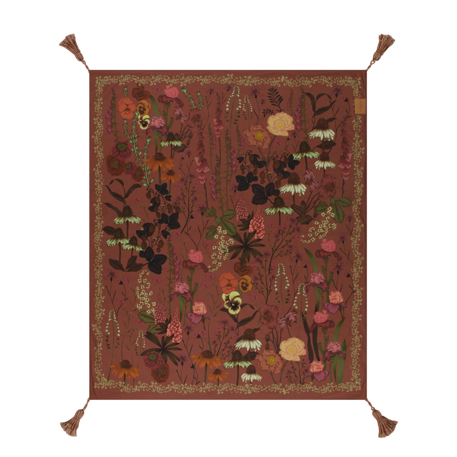 Inspired by the soft romance of English garden blooms, the Flourish Sienna Picnic Rug features lovingly illustrated flowers with expressive brushstrokes and intricate hand-drawn line-work.