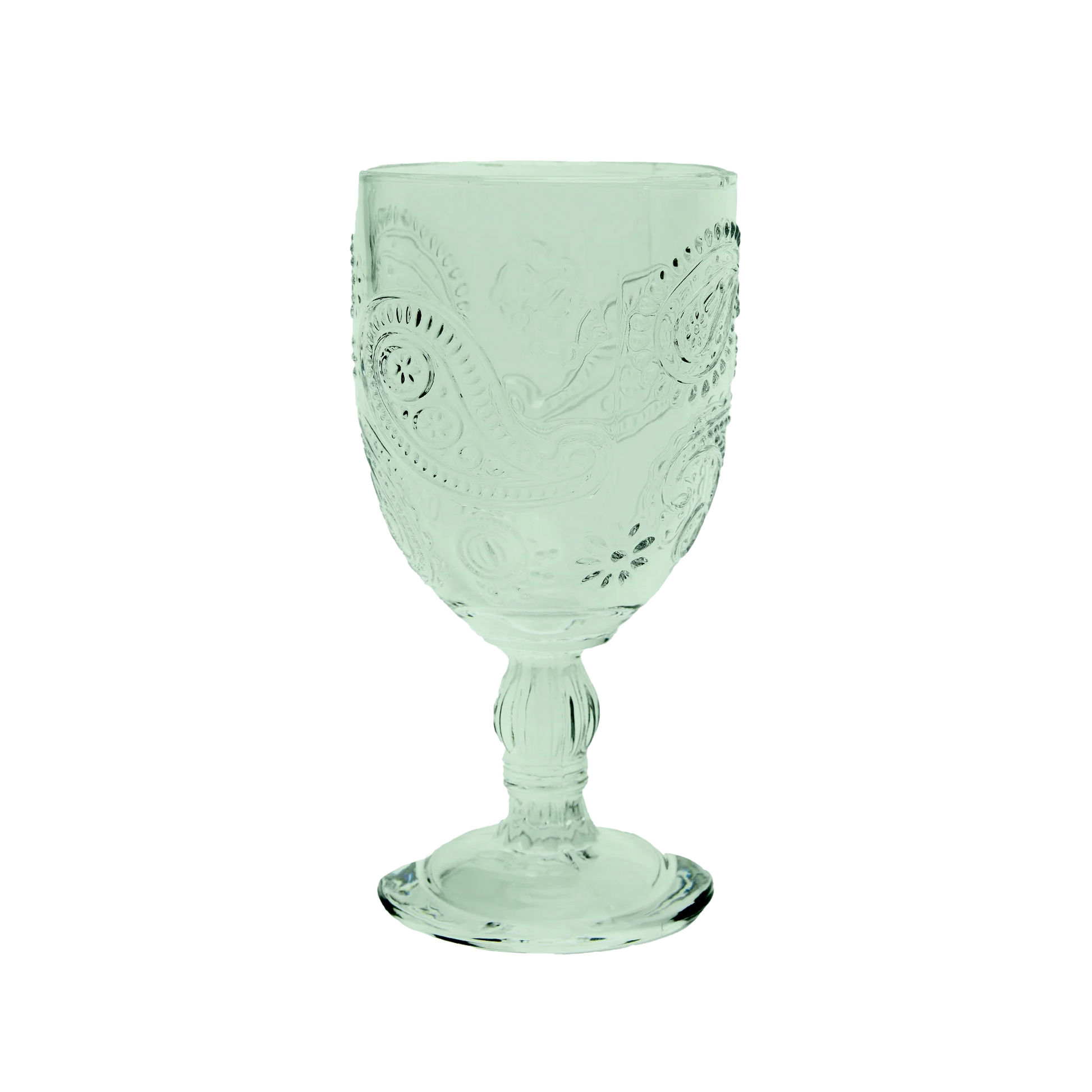 Wandering Folks stunning Goblet glass set of two are made from a durable, thick glass that features a beautiful embossed design, available in three colours. Decorative and functional, they add elegance to any soiree!