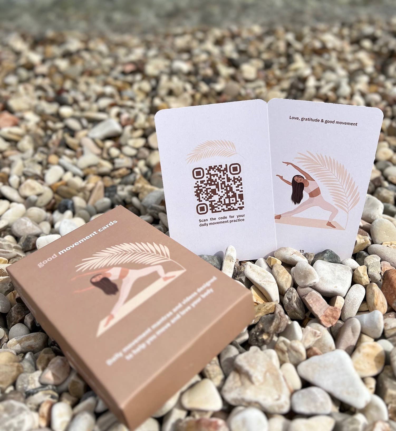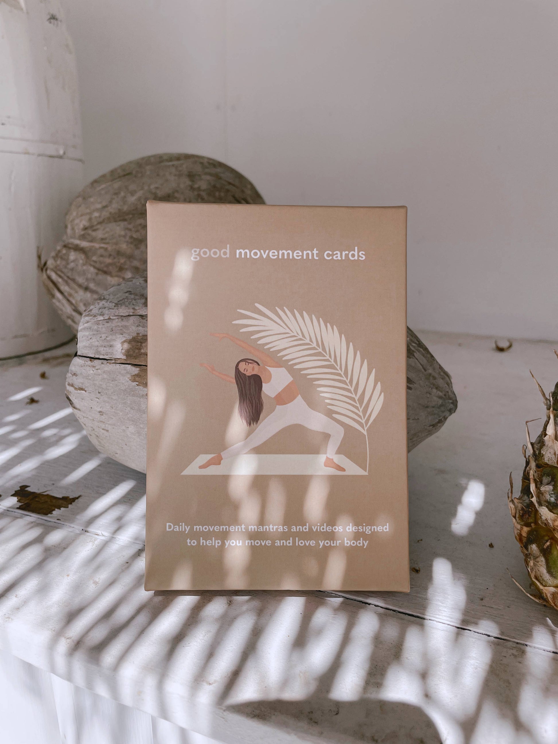 44 movement based affirmation cards that each link (via QR code) to a 5-10 minute mindful movement video. Simply scan the QR code on the back of the card to access your daily stretches instructed by Good Movement Company director Tiffany.
