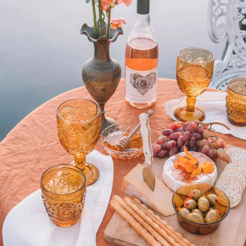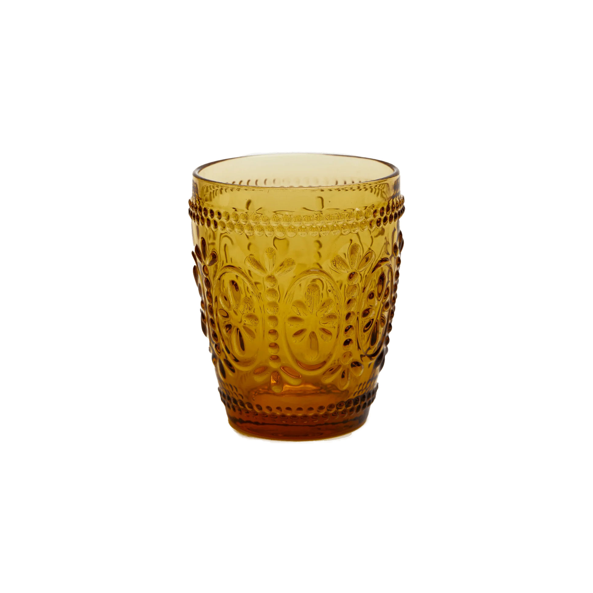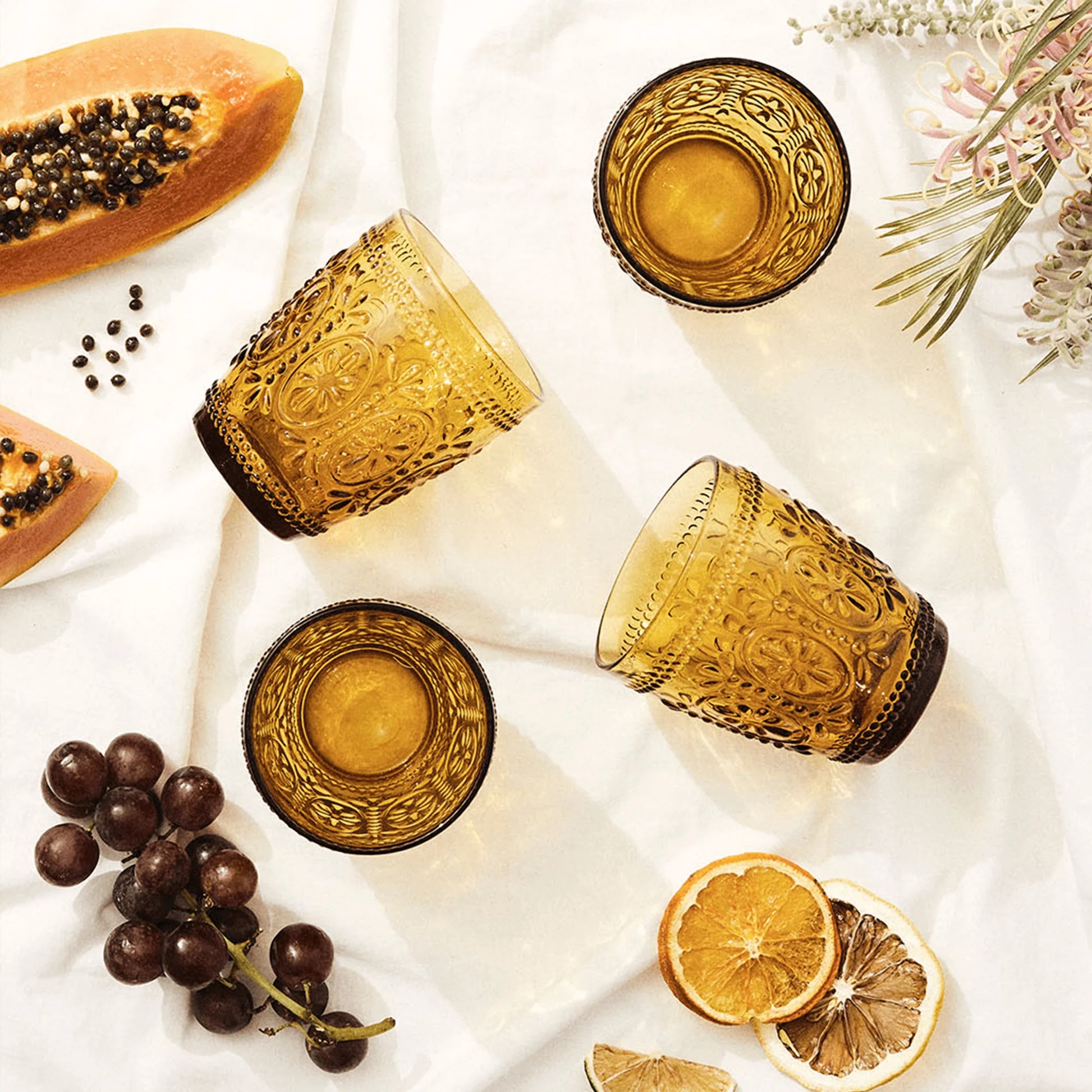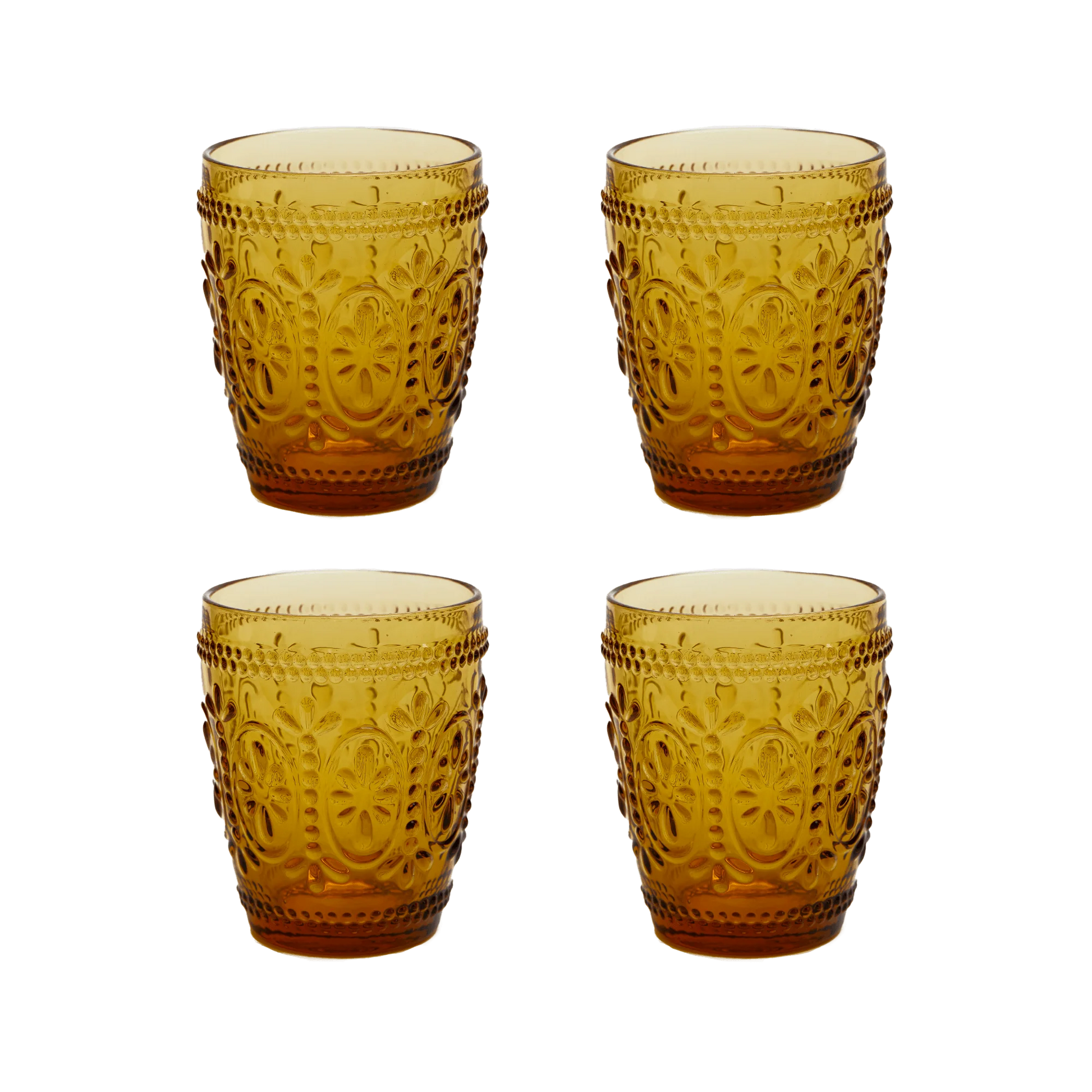 Wandering Folk's set of four Tumblers feature a beautiful embossed design made from a durable, thick glass. Decorative and functional, their embossed texture adds elegance to any cold beverage at your picnic or home.